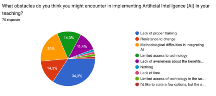 According to the needs analysis carried out by the partners, 97% of teachers think that it is necessary to develop skills in digital intelligence and AI. The most relevant identified obstacles in implementing the use of AI are a lack of proper training and methodological difficulties